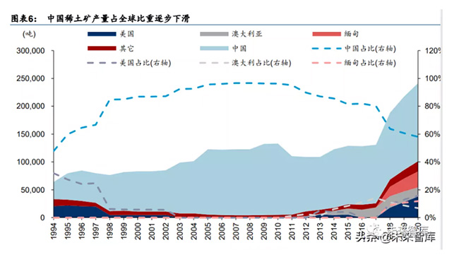 從 USGS 公布的歷史數據看,18 年前,全球主要依賴中國 供應稀土礦,中國稀土礦供應總量占比常年維持高位。18 年起,海外開始強化對自有礦山 稀土資源的開采,稀土產量貢獻占比逐漸提高。據 USGS,2020 年中國配額產量占全球總 供應量的 58%,較 2017 年 80%的占比顯著下降。但因中重稀土資源主要集中在中國和緬 甸,因此實際全球只有輕稀土進入多元供應格局,中重稀土仍主要由中國和緬甸產出。