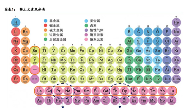 稀土是指元素周期表中的 17 種鑭系和其他相似的元素氧化物的總稱。十七種稀土元素通常 分為輕稀土和中重稀土,其中輕稀土包含鑭、鈰、鐠、釹等;重稀土包含釓、鋱、鏑、鈥 等。自然界中共有 250 余種稀土礦,其中中重稀土礦由于價值高儲量少,比輕稀土更寶貴。