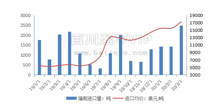 2020年3月未列明氧化稀土進口總量是2659噸,大幅上漲。其中緬甸進口量為2499噸,環比上漲75.6%。進口均價為17214美元/噸,環比上漲11%。