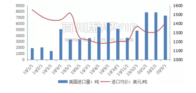 2020年3月稀土金屬礦進口總量是7427噸,環比下跌。其中美國進口量為7352噸,環比下降6.5%。進口均價為1400美元/噸,環比上漲7.13%。(百川盈孚)
