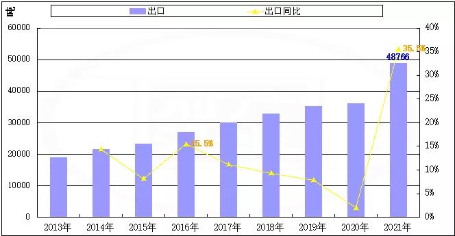 具體而言,2021年我國稀土永磁體出口48765.588噸,同比增長35.5%。該出口量創歷史紀錄,并首次突破4萬噸且大幅超出并逼近5萬噸;同時,2021年的出口量增長幅度亦遠超以往。根據近9年的數據,此前出口量增長幅度最大僅為15.5%。